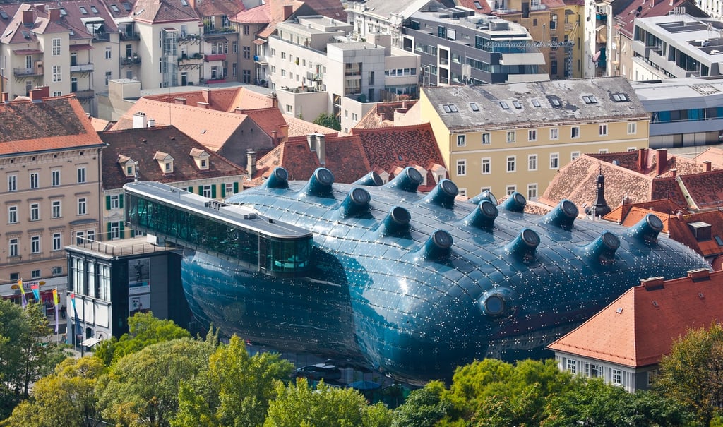 Di jantung kota Graz yang dipenuhi bangunan Barok dan Medieval, tiba-tiba muncul sebuah bentuk aneh berwarna biru gelap. Warga menyebutnya Friendly Alien, makhluk ramah yang mendarat di tengah kota. Itulah Kunsthaus Graz, museum yang seolah datang dari masa depan ketika Graz terpilih menjadi European Capital of Culture pada 2003. Oleh Peter Cook dan Colin Fournier, museum ini sengaja dirancang untuk mematahkan kebiasaan. Alih-alih kotak kaku seperti museum pada umumnya, bangunannya dipenuhi lengkung-lengkung organik yang membuatnya terlihat hidup. Berdiri di tepi Sungai Mur, bentuknya seperti menyapa siapa pun yang melintas, seakan berkata bahwa kota ini tidak takut bereksperimen.