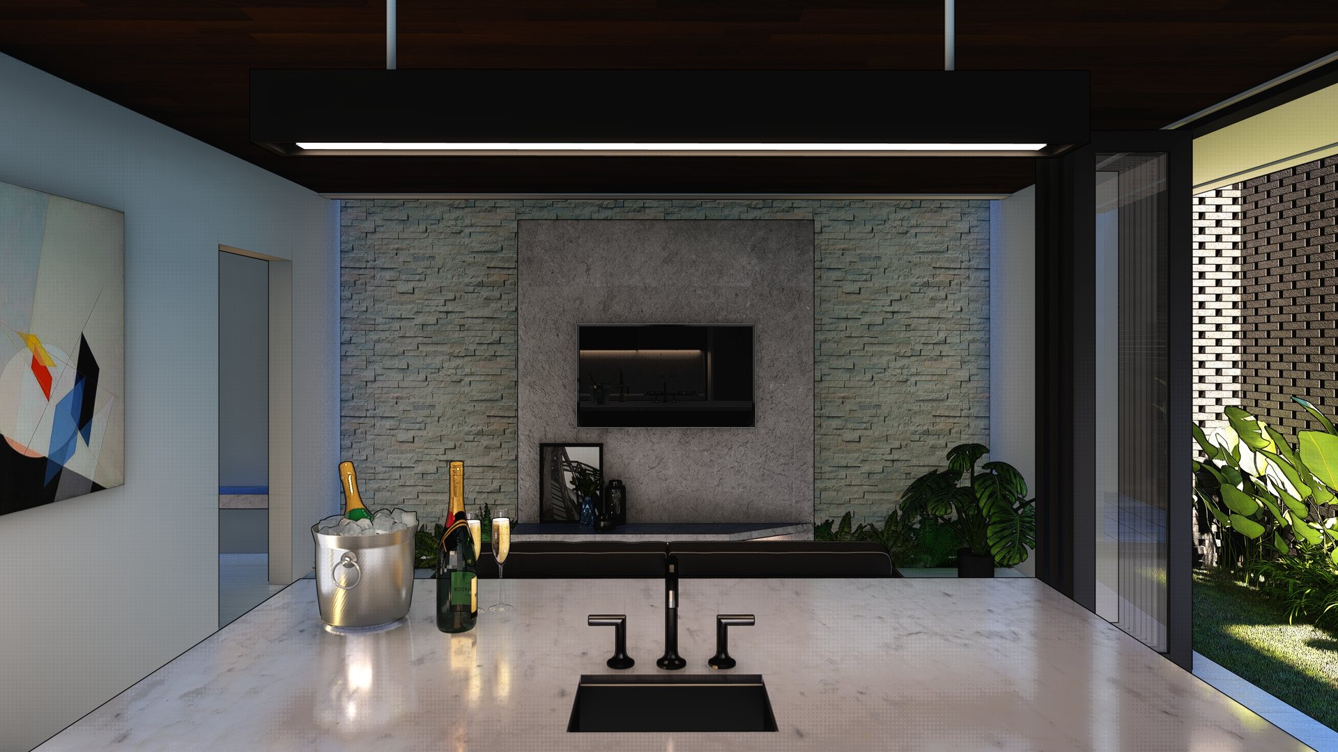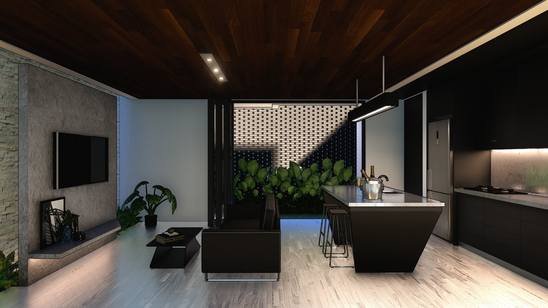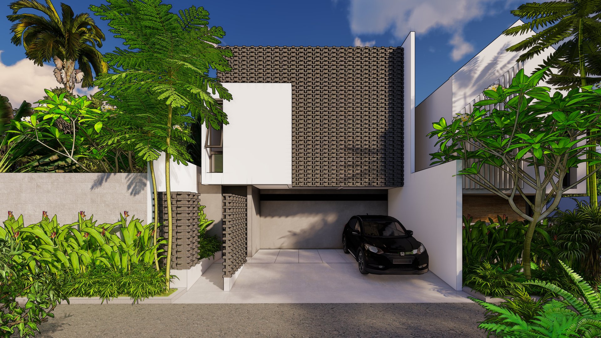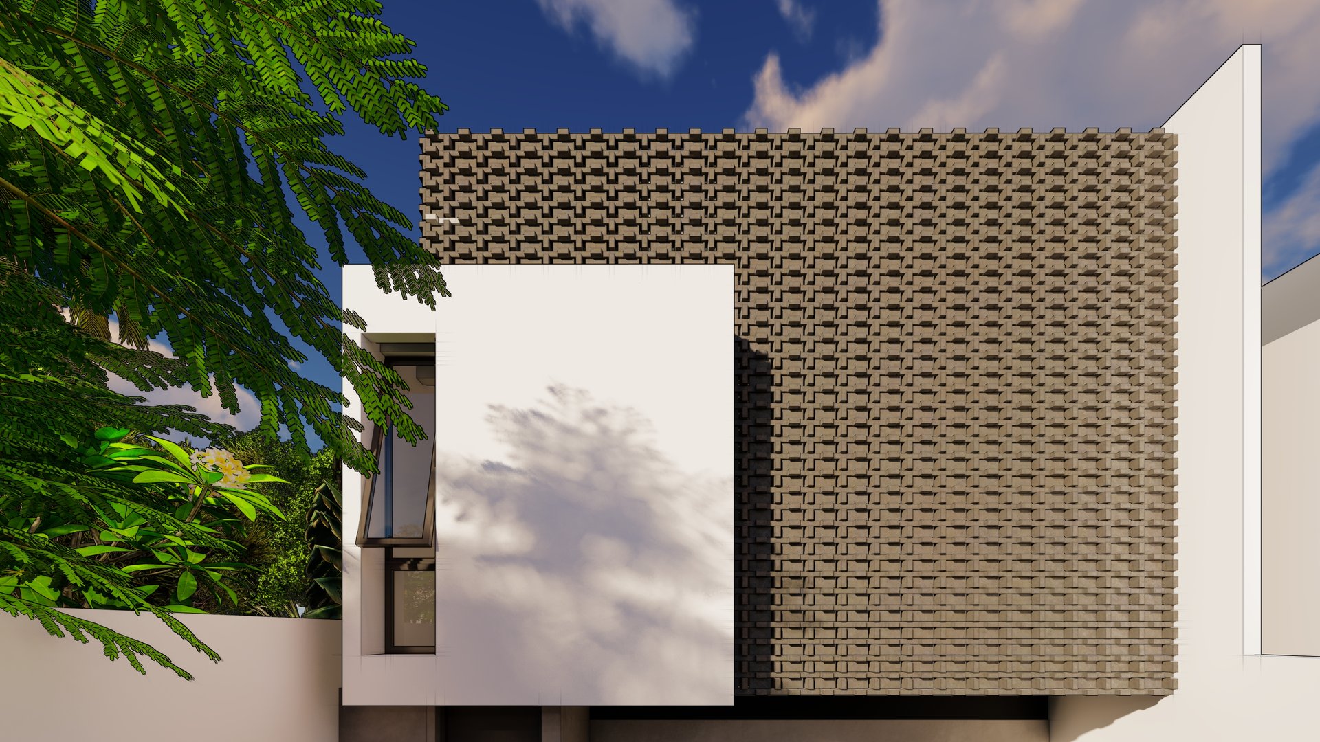 Secara visual, rumah ini didominasi warna hitam baik di fasad maupun interior. Pilihan warna ini bertujuan untuk mengontrol suasana ruang agar terasa lebih tenang dan tidak ramai secara visual. Secondary skin dari bata yang dicat hitam digunakan sebagai lapisan privasi dari arah jalan, sekaligus memberi kedalaman pada fasad tanpa harus mengandalkan ornamen yang berlebihan.