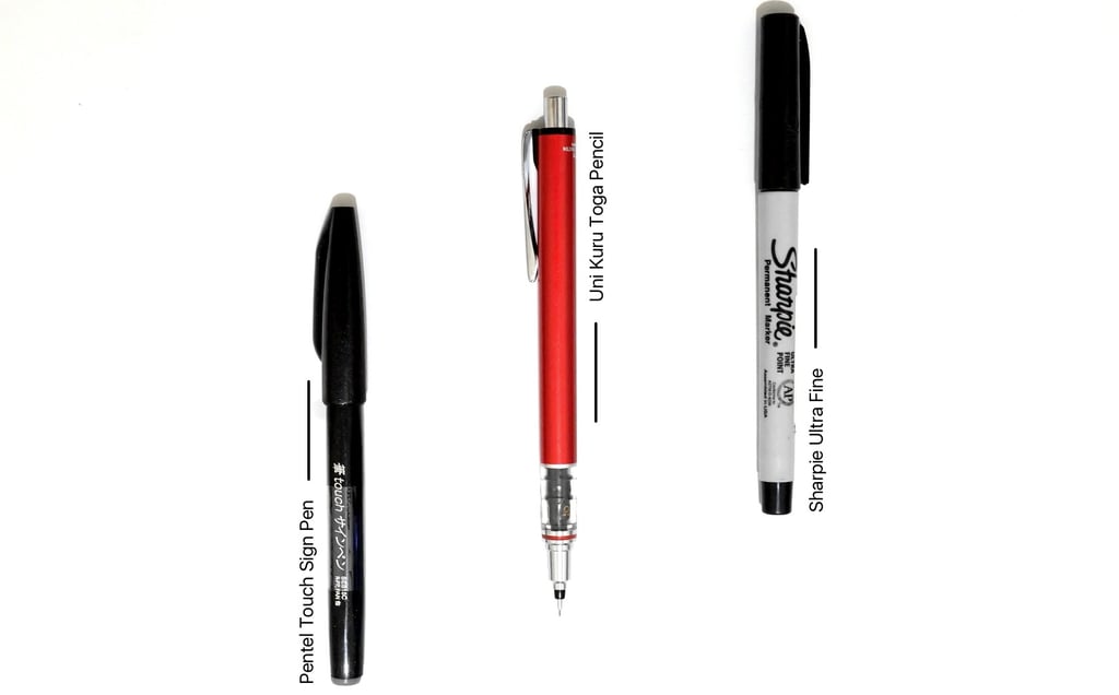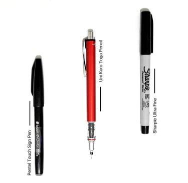 Pentel Touch Sign Pen dan Sharpie Ultra Fine, sangat pas digunakan di atas kertas tracing/kalkir.