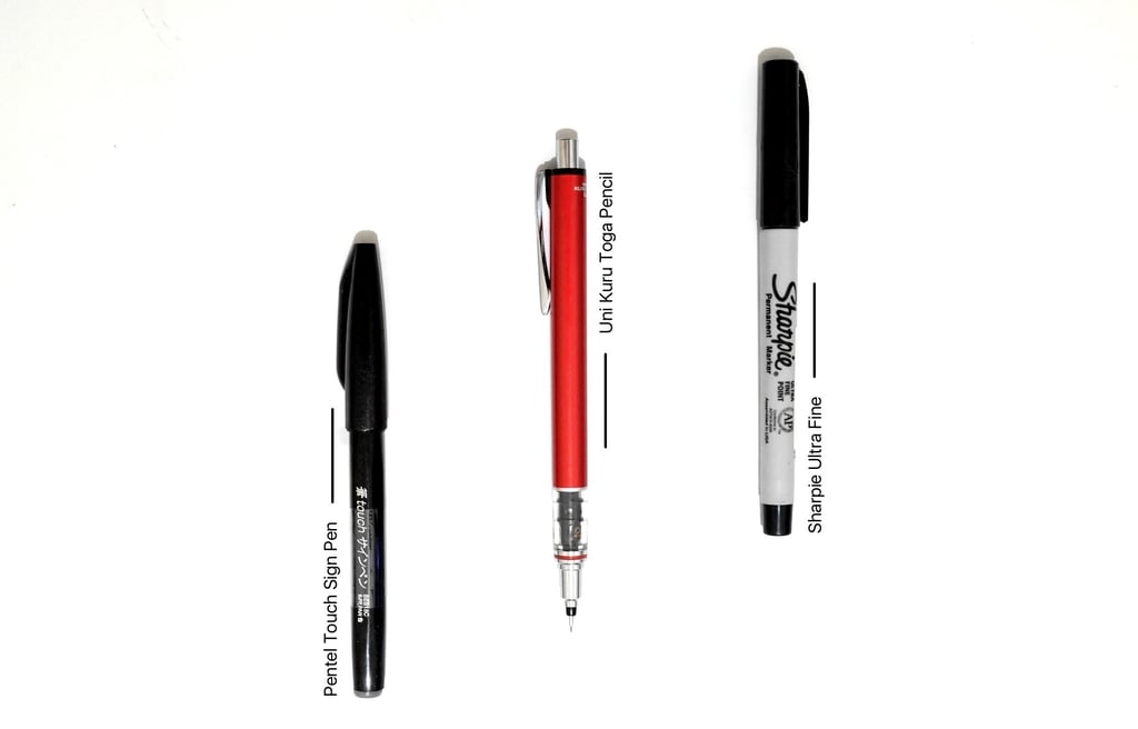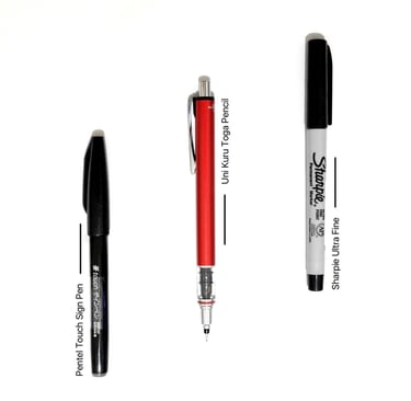 - Pentel Touch Sign Pen dan Sharpie Ultra Fine, sangat pas digunakan di atas kertas tracing/kalkir.