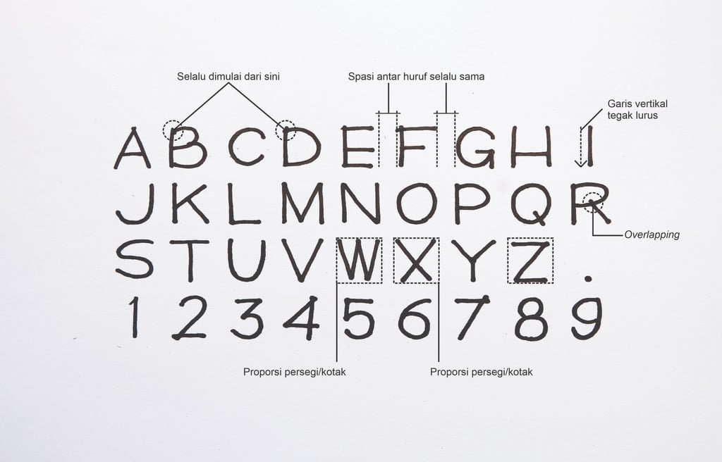 - Dahulukan membuat garis vertikal dibanding horizontal. Hal ini bertujuan untuk membuat garis horizontal di beberapa huruf lebih proporsional.