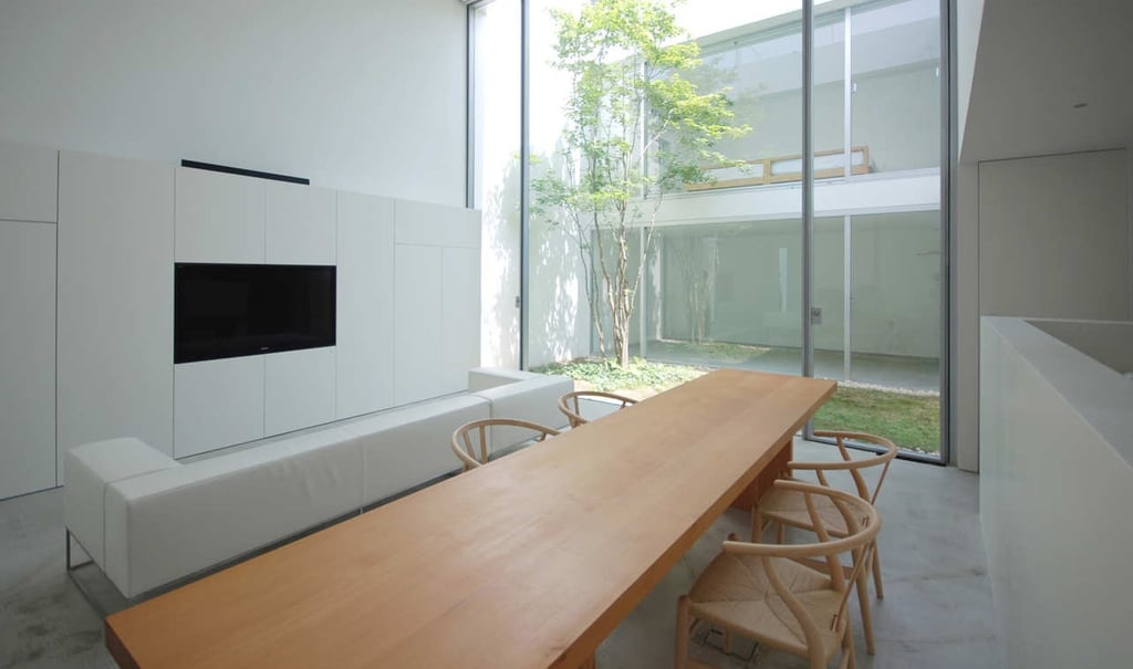 Warna putih di seluruh bidang ruang dipadu dengan aksen hitam di perabot. Image by shinichiogawa.com