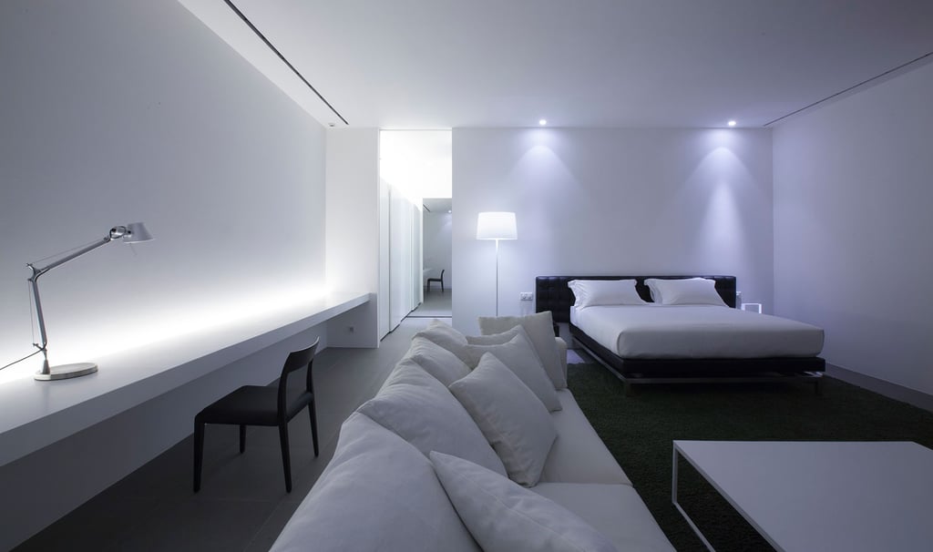 Pilih warna putih sebagai warna yang dominan pada dinding, lantai, dan plafon. Warna putih membuat ruangan terkesan luas dan terang daripada kondisi sebenarnya. Sebagai aksen, gunakan furniture bermaterial kayu dengan warna yang lembut. Hal ini bisa sedikit menetralkan kesan ‘dingin’ dari warna putih yang terlalu mendominasi.